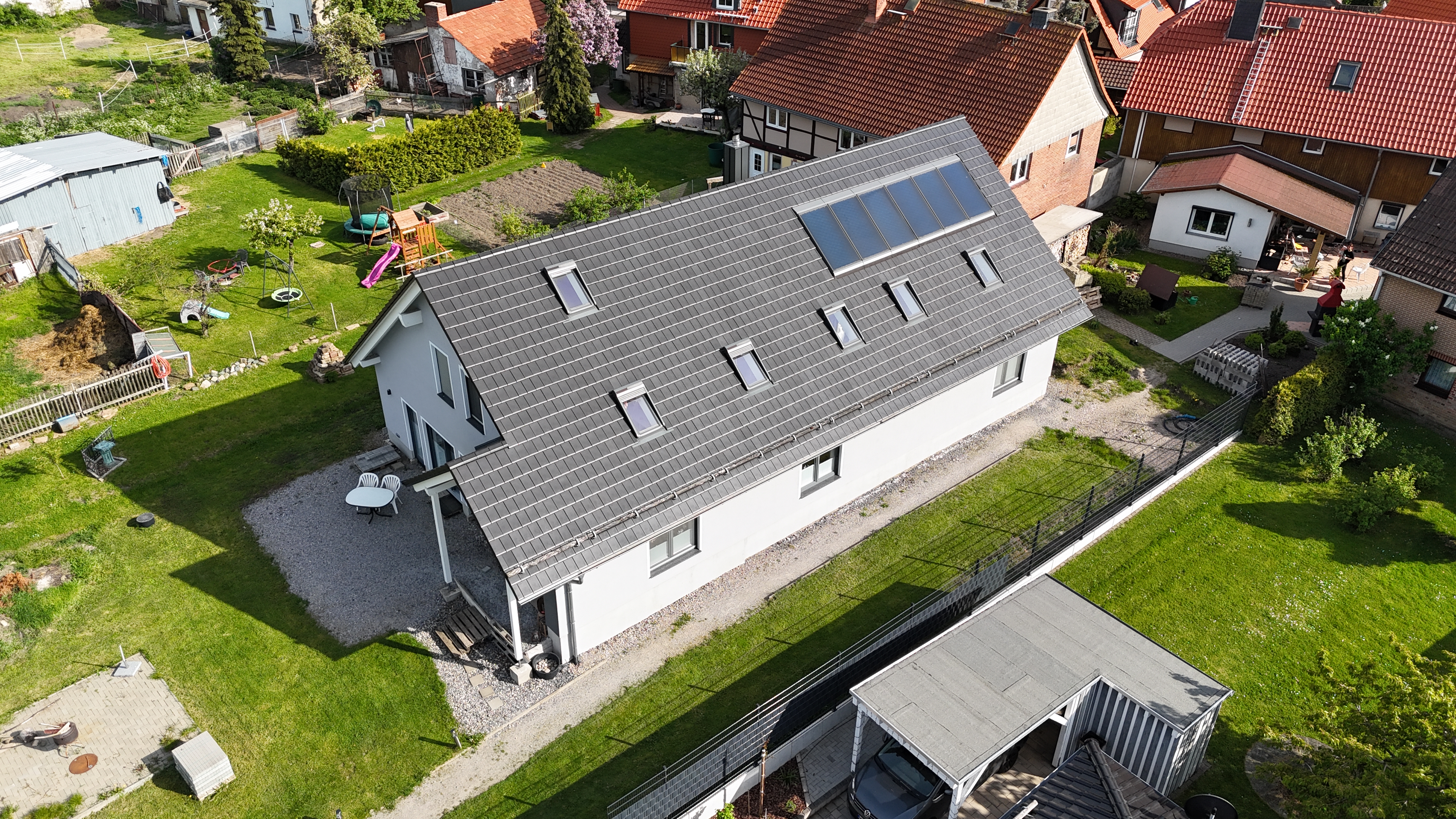 Beim Haus selber handelt es sich um ein anderthalbgeschossiges, sowie freistehendes, modern errichtetes Einfamilienhaus aus dem Jahr 2018. Hier wurde nicht gekleckert, sondern geklotzt. Das Haus ist in seiner Form einzigartig. Kein Haus von der Stange. Es besitzt einen Vorder- und Hintereingang und auch leicht als Zweifamilienhaus umgenutzt werden. Darüber hinaus bietet das wunderschön geschnittene Haus ganz viele Besonderheiten und ist technisch auf neuestem Stand. Da die Außenanlage noch nicht gestaltet ist haben Sie sogar hier noch die Möglichkeit Ihre individuelle Note oben drauf zu setzen.