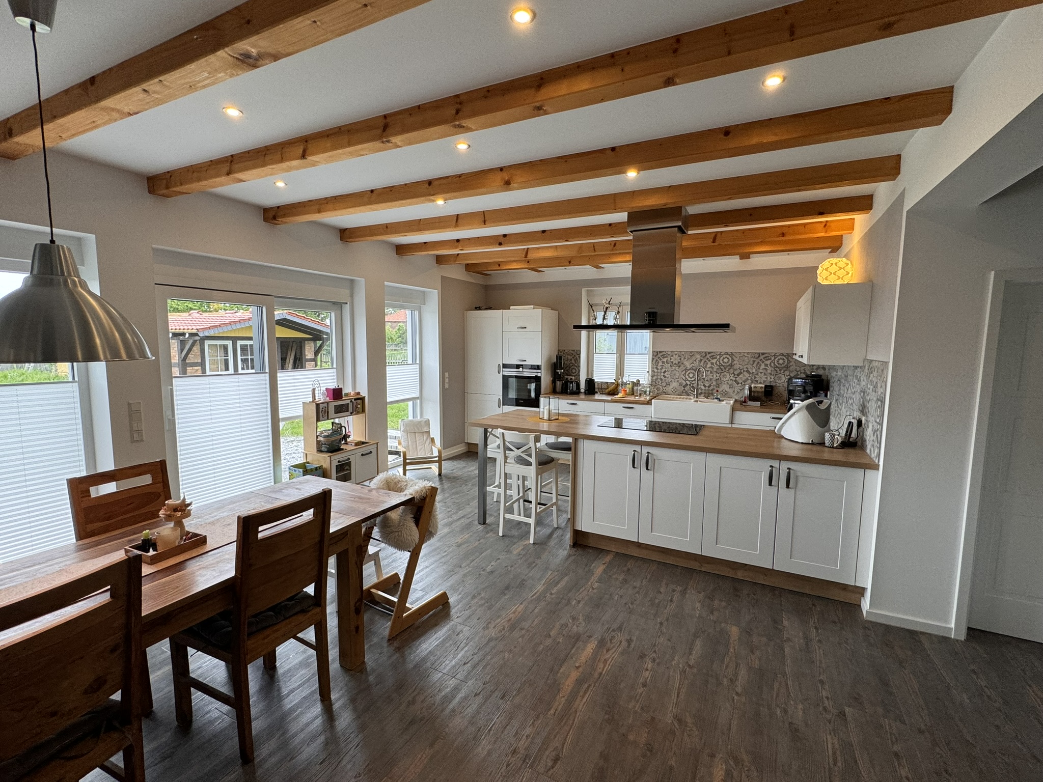 Diese Gemütlichkeit wird noch einmal durch den erstklassigen und stilvollen Kaminofen unterstrichen, der nicht nur gut aussieht, sondern für eine schöne Wärme sorgt. Das Warmwasser wiederum wird zusätzlich über die bereits erwähnte thermische Solaranlage gewonnen, so dass Sie die Energiekosten für dieses große Haus dennoch sehr niedrig halten können. Im Jahr 2023 lagen die monatlichen Gaskosten unter 90 Euro bei einer fünfköpfigen Familie.